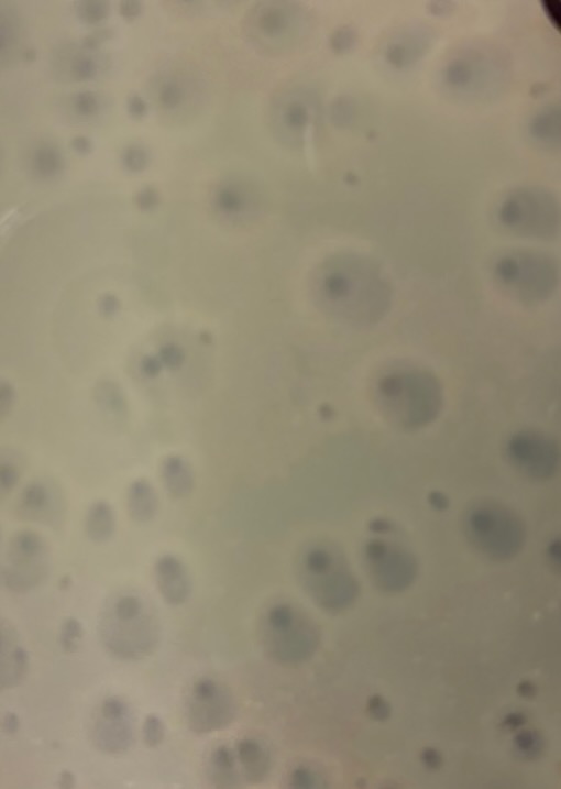 | Plaque Notes | Plaques are clear in the center with a turbid edge. As the phage would get more concentrated, the plaques would get smaller and clearer. After 24 hrs incubation at 34°C, plaques show a clear center and slight turbid ring, seeming to appear somewhat oval, though the shape of the turbid ring would shift. Typically, Albertus was around 4mm in width, but as the amount of plaques on a plate got larger, Albertus could get as small as 1-2mm. |