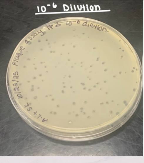 | Plaque Notes | Clear, round, and defined edges Small uniform, and circular plaque shape All assays showed uniform plaque size and shape, which suggests we have one type of phage |