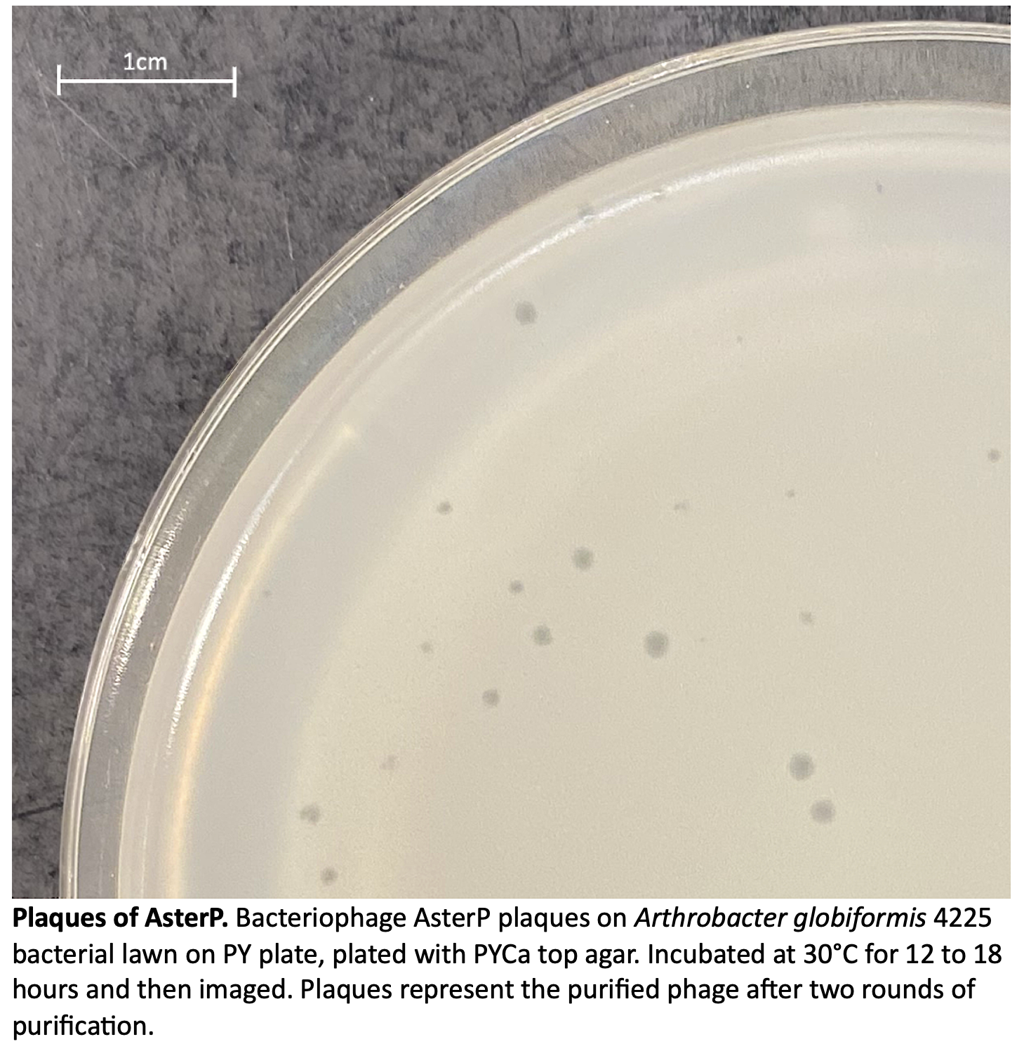 Discovery Notes | The phage AsterP was found in a damp area with wildflowers at the edge of a forest, mostly in the sun. The soil temperature was 19,6°C and the ambient temperature was 21,3°C. The soil was collected approximately 2 cm below the surface. |