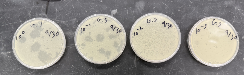 | Plaque Notes | BarneyBeans' plaques started out with very large, blob-shaped, and contaminated holes, but after dilution the plaques became clean, circular, and much smaller. |