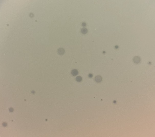 | Plaque Notes | There are a mix of both clear, lytic plaques and cloudy, lysogenic plaques. The lysogenic plaques have bullseye patterns or rings in the center of the plaque. Plaque size varies among both lytic and lysogenic plaques. The largest plaques measure 0.2cm, and the smallest plaques measure 0.1cm. The mean of plaque sizes is 0.16cm. The mode and median is 0.2cm. |