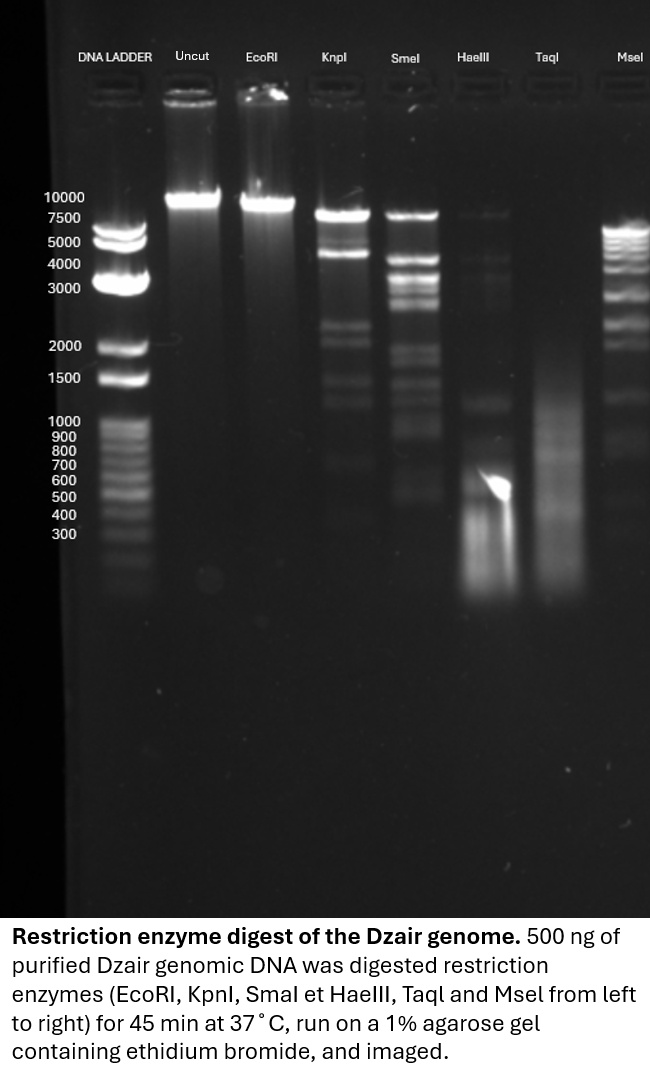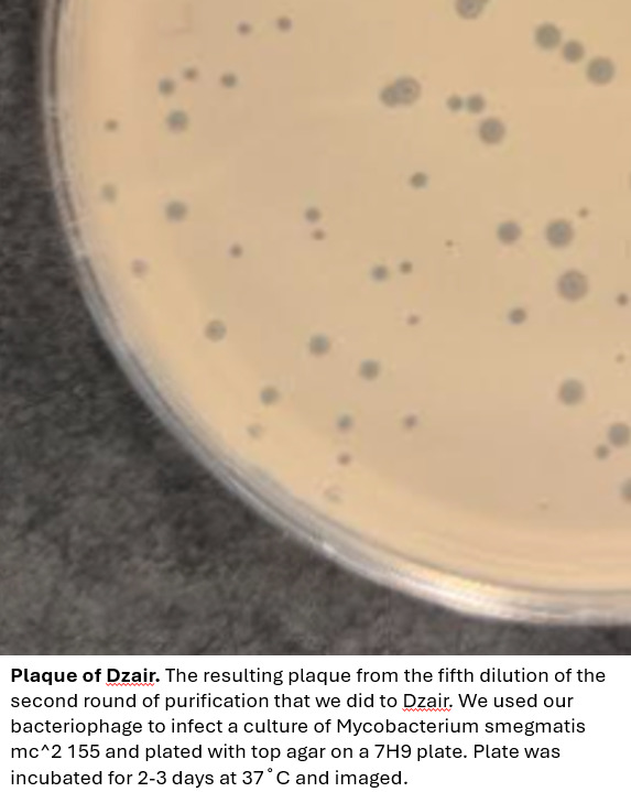 | Discovery Notes | The discovery was made at Blackburn Hamlet's community garden, by a flower bed. Genomic DNA was sequenced using an ONT MinION platform with R10.4.1 chemistry. Quality-filtered (Q10) reads were assembled, producing a longest contig of 44,404 bp with approximately 49× coverage. BLAST analysis showed that this contig shares 95.5% nucleotide identity and 88% query coverage with its closest related phage, BuzzLyseYear (cluster F1). BuzzLyseYear has a genome length of 59,419 bp, and the assembled Dzair contig represents approximately 73.6% of this length. |