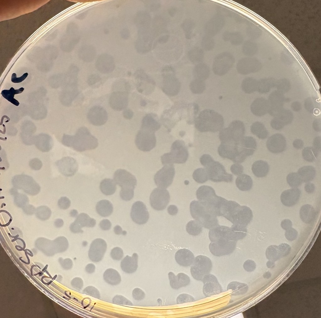 | Plaque Notes | After the serial dilutions, plaques were relatively large and clear. The plate was abundant with plaques even getting to the 5th and 6th dilutions. After getting my webbed plate and collecting the lysate, plaques are much more abundant and much much smaller. Still clear and circular. |
