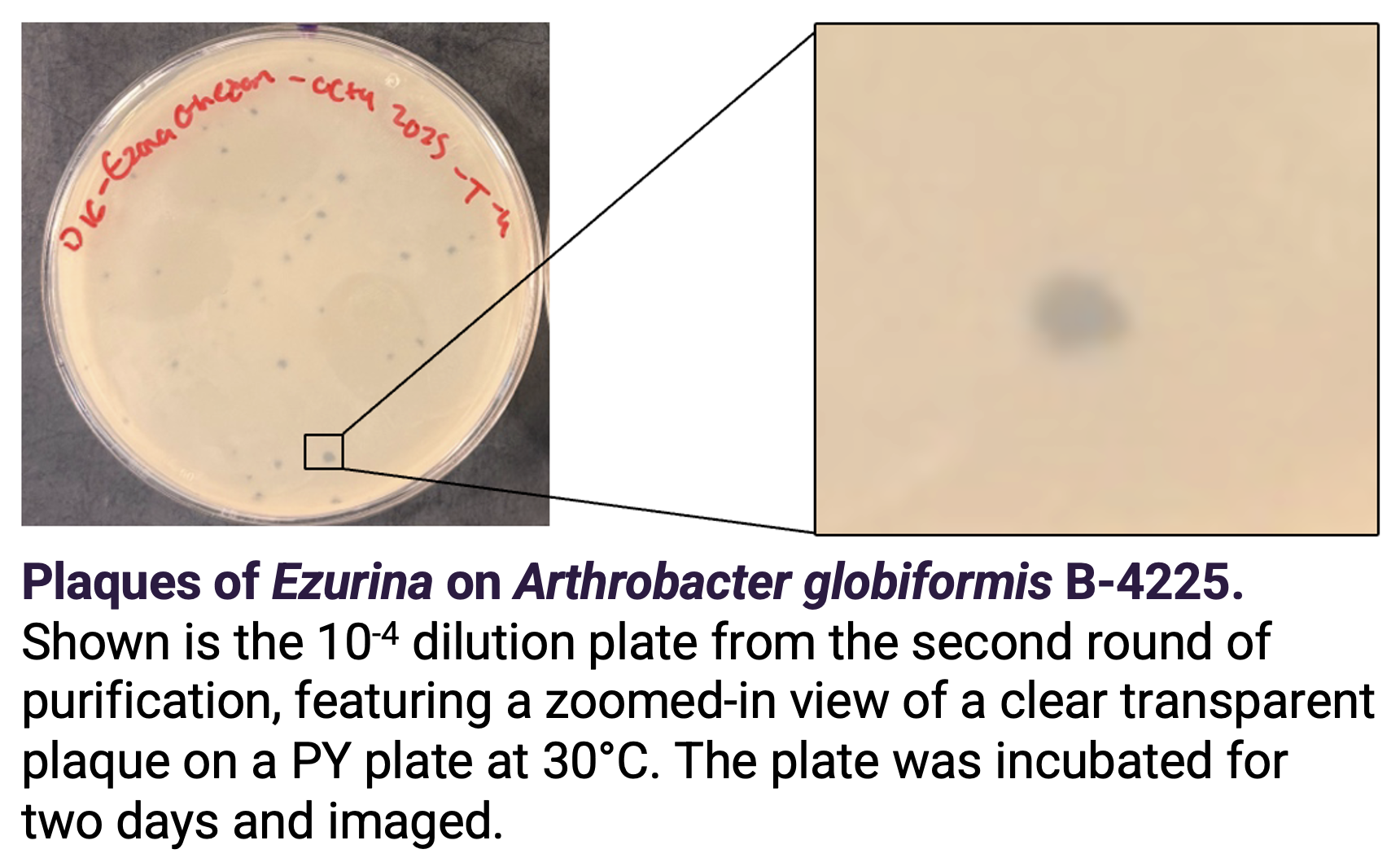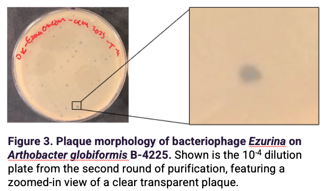 | Plaque Notes | The plaques were round and clear. Only a few plaques were present on the 10⁻4 purified plate. |