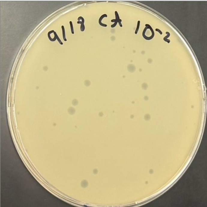 | Plaque Notes | The plaques are small, circular, and relatively uniform in diameter, measuring approximately 1–3 mm (0.1–0.3 cm). They exhibit slightly cloudy (turbid) centers rather than fully clear zones, indicating partial lysis and suggesting a temperate phage phenotype. |