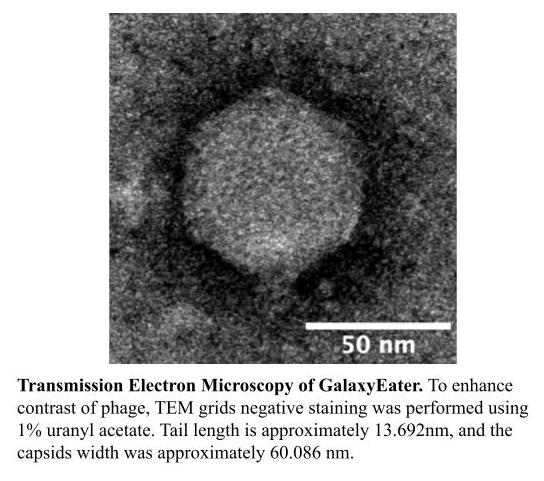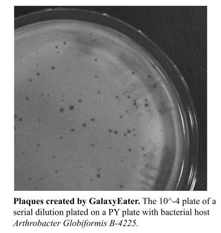 | Lysogeny Notes | GalaxyEater exhibits notable temperate characteristics. The longer latency period, turbid plaque edges, and small burst size all support this conclusion. |