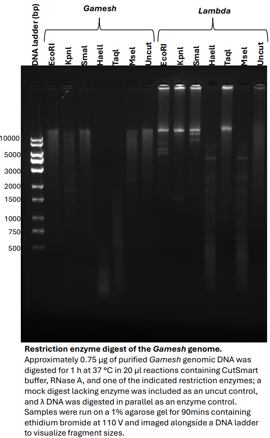 | Discovery Notes | Phage Gamesh was discovered in a corn plot at Kilborn’s Community Garden in dark, loamy soil at an ambient temperature of 24 °C. Phage Gamesh DNA was sequenced by Oxford Nanopore (MinION) using a barcoded ligation library. Reads were assembled with Flye and polished with Racon, producing a high-confidence genome assembly (~42–43 kb) with ~58× coverage. The main circular contig (barcode023_racon2.fasta) was used for downstream analysis and BLAST comparison, which placed Gamesh in the mycobacteriophage cluster B1. |