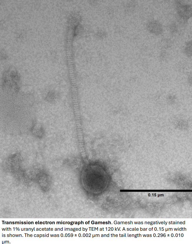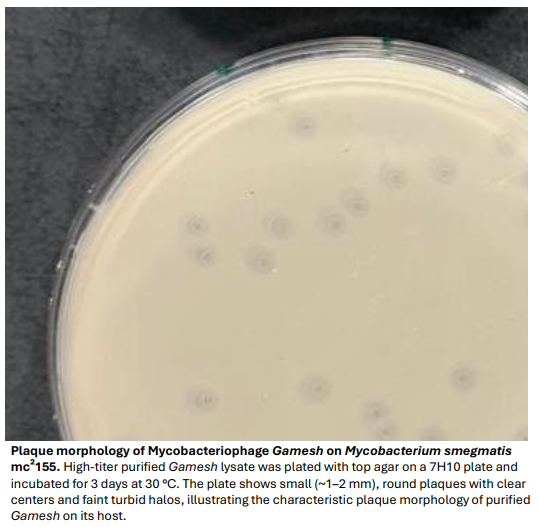 | Plaque Notes | On M. smegmatis mc²155 at 37 °C, Gamesh forms small (~1–2 mm), round plaques with clear centers and a faint, turbid halo, giving a subtle bullseye appearance. Plaques are well-defined and fairly uniform across dilutions, with no obvious concentric rings or plaque “filling in” even after extended incubation (24–48 h). I did not observe mixed turbid vs. clear morphologies on the same plate. |