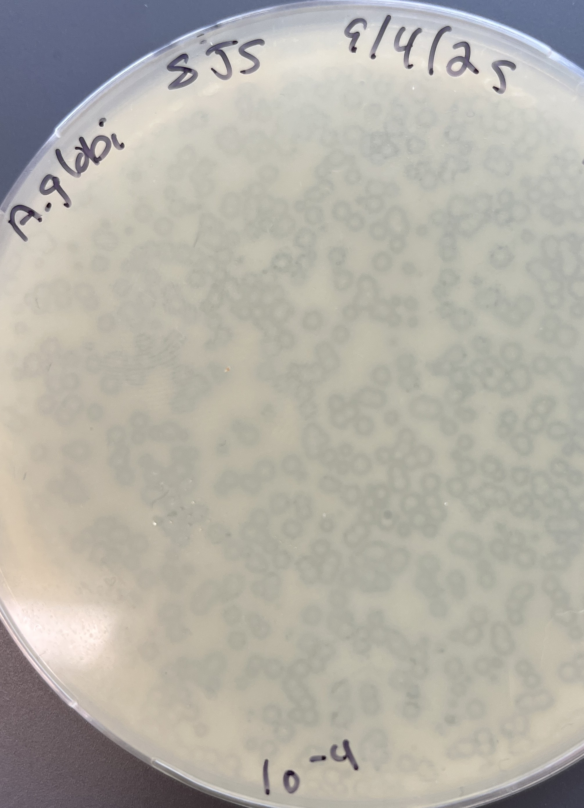 Plaque Notes | The plaques are about 2-3mm in diameter at lower concentrations and 1-2 mm in diameter at higher concentrations. They are turbid in the middle but clear around the margins. |