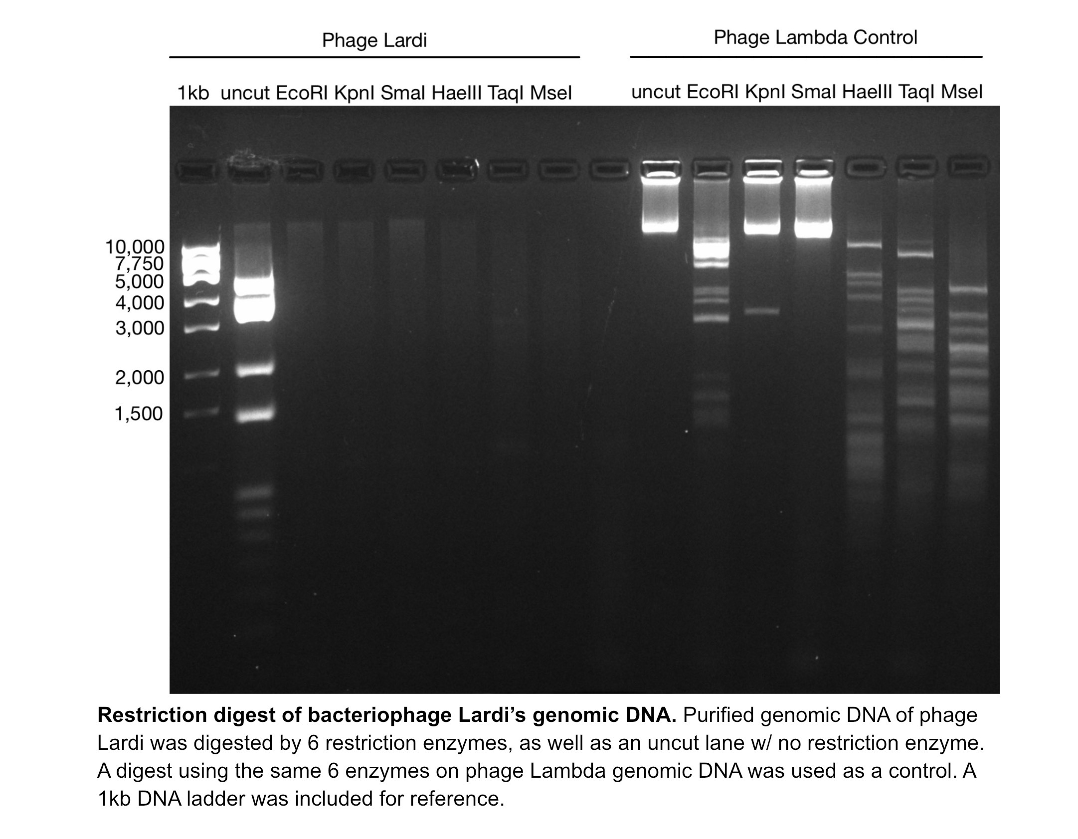 | Plaque Notes | Small, pinpoint, clear plaques less than or equal to 1mm in diameter, with well-defined boundaries. Genomic DNA was sequenced on a ONT Minion, R10.4.1 chemistry. The sequence assembled into ten contigs, with the longest one being 6589 bp with 87% query cover, 96.15% identity to Rasputia (GC). The sequence was assembled into a second-longest contig of 6305 bp with 99% query cover, 98.58% identity to Rasputia (GC). |