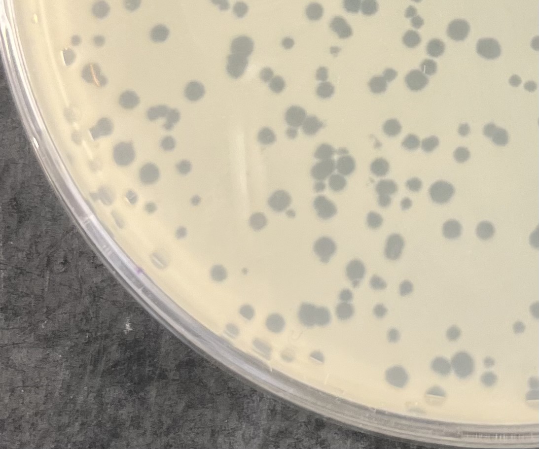 Plaque Notes | The plaques are clear and circular, measuring approximately 1-2 mm in diameter. They exhibit uniformly lytic centers with smooth, well-defined edges and no surrounding halo, set against an opaque bacterial lawn. |