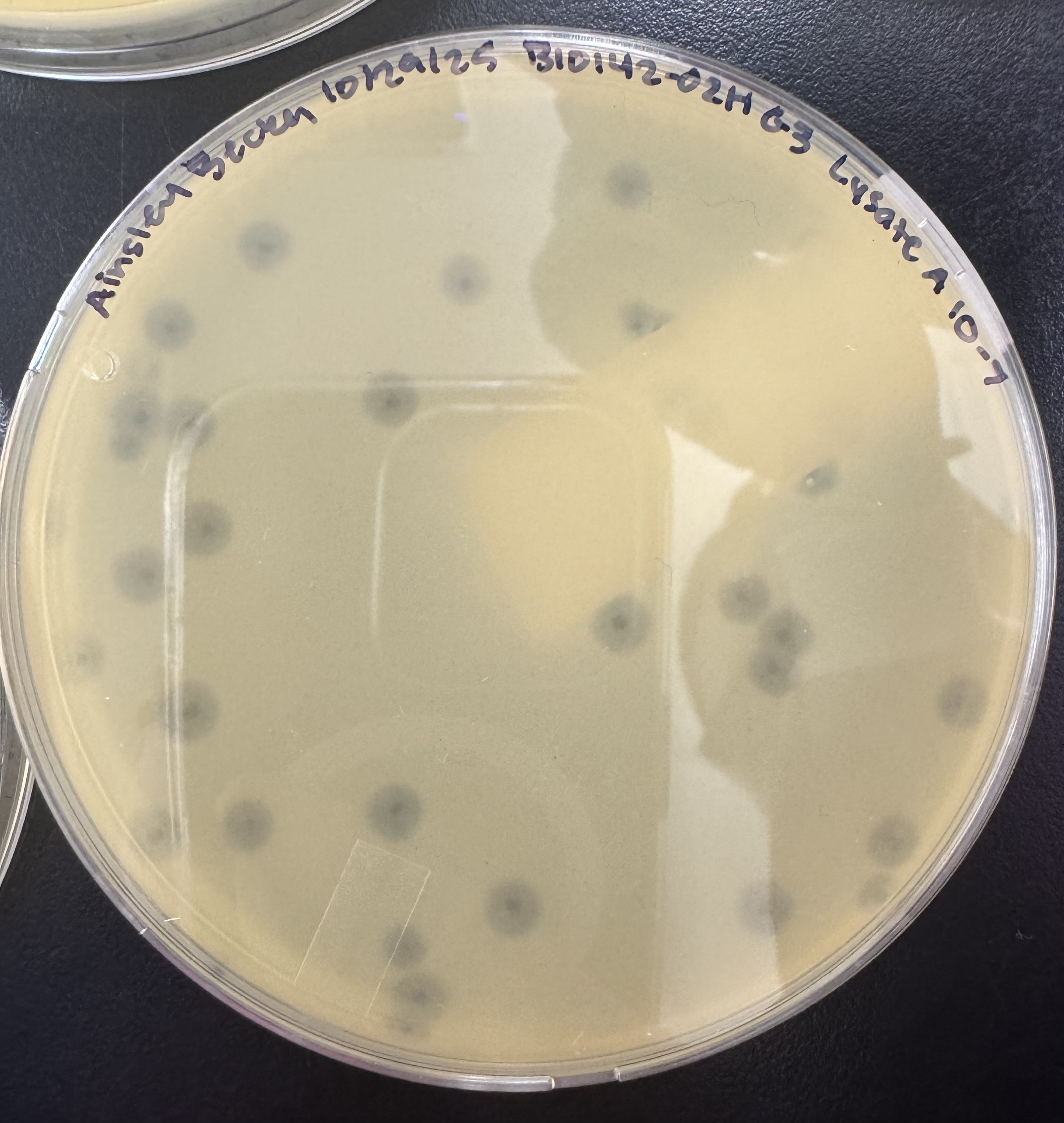 | Plaque Notes | Medium size (3mm) with a bullseye straight down the middle with a cloudy outer ring. As purification proceeded, plaques grew (to 5mm), bullseye clearing expanded from 1mm to 2mm, and the cloudy outer ring shrank. Both clear and turbid margins, with the clear center being clear and the outer ring being turbid. |