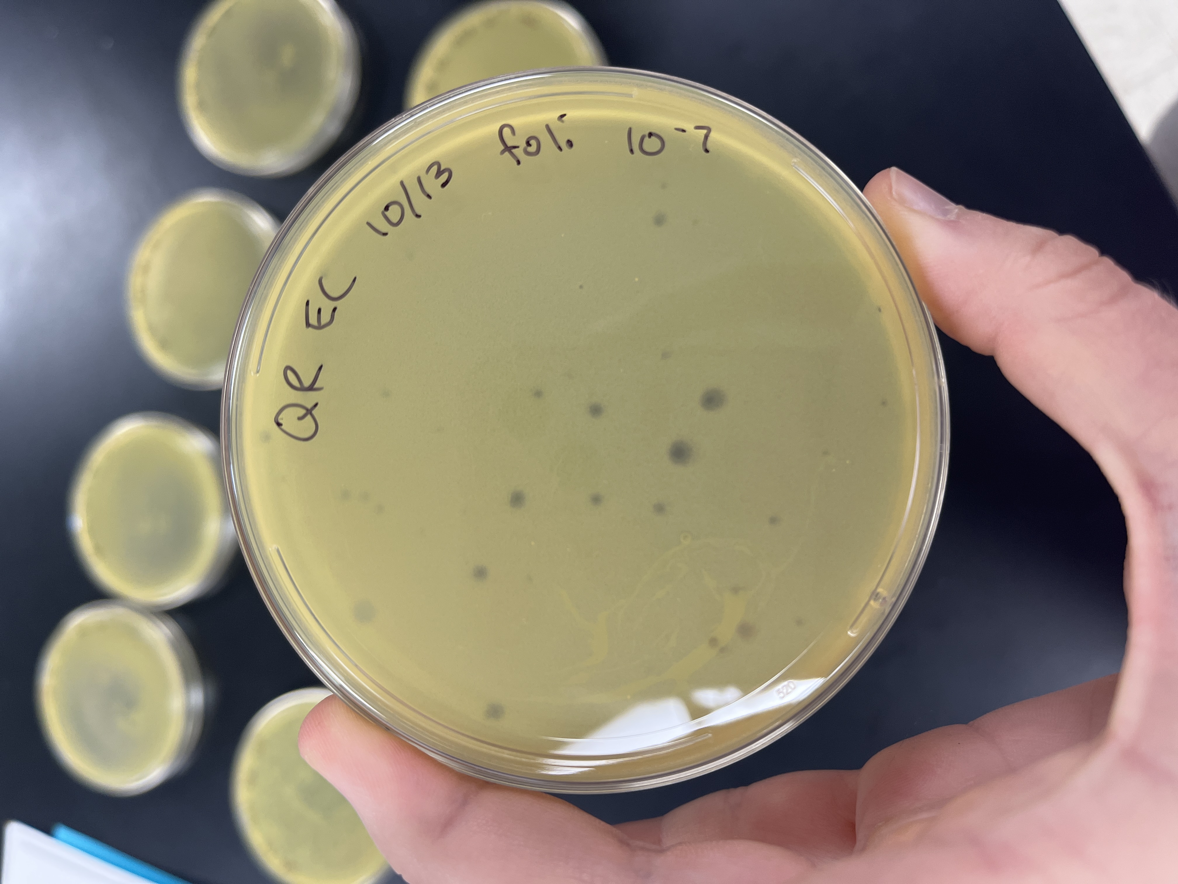 | Plaque Notes | Our plaques began in two different sizes and morphologies, but became more uniform after our last purification and plate webbing. Starting, there were very small clearings, around 1 mm in diameter, almost appearing like dots. There were also larger plaques, around 4 mm in diameter, with halos and a more turbid appearance. During our third round of purification, it was hard to tell the plaque morphologies because we had an issue with the diluion of our plates. The concentration of 10^0 was the only one with plaques; however, it was plaqued out, so one could not obtain a morphology. The other plates did not have plaques on them so there must have been an error made while making the dilutions. However, we were able to use the plaqued out plate to make our lysate. From the lysate, we were able to make eight high-quality diluted plates. On these plates, we could see the plaques better and were able to observe their morphologies. The plaques were uniform this time, all around 2 mm in diameter and clear wih no halos. |
