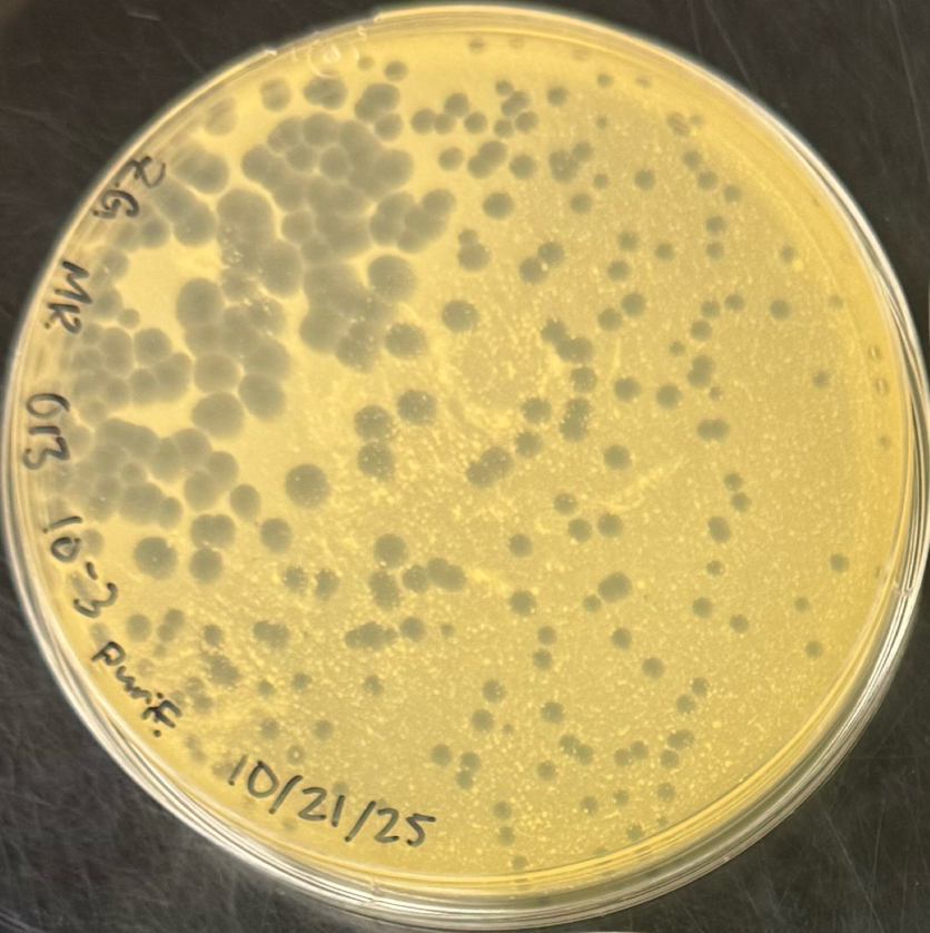 | Plaque Notes | Plaques vary in size from ~0.05cm to ~0.8cm. Clear, circular plaques indicating a lytic lifecycle. |