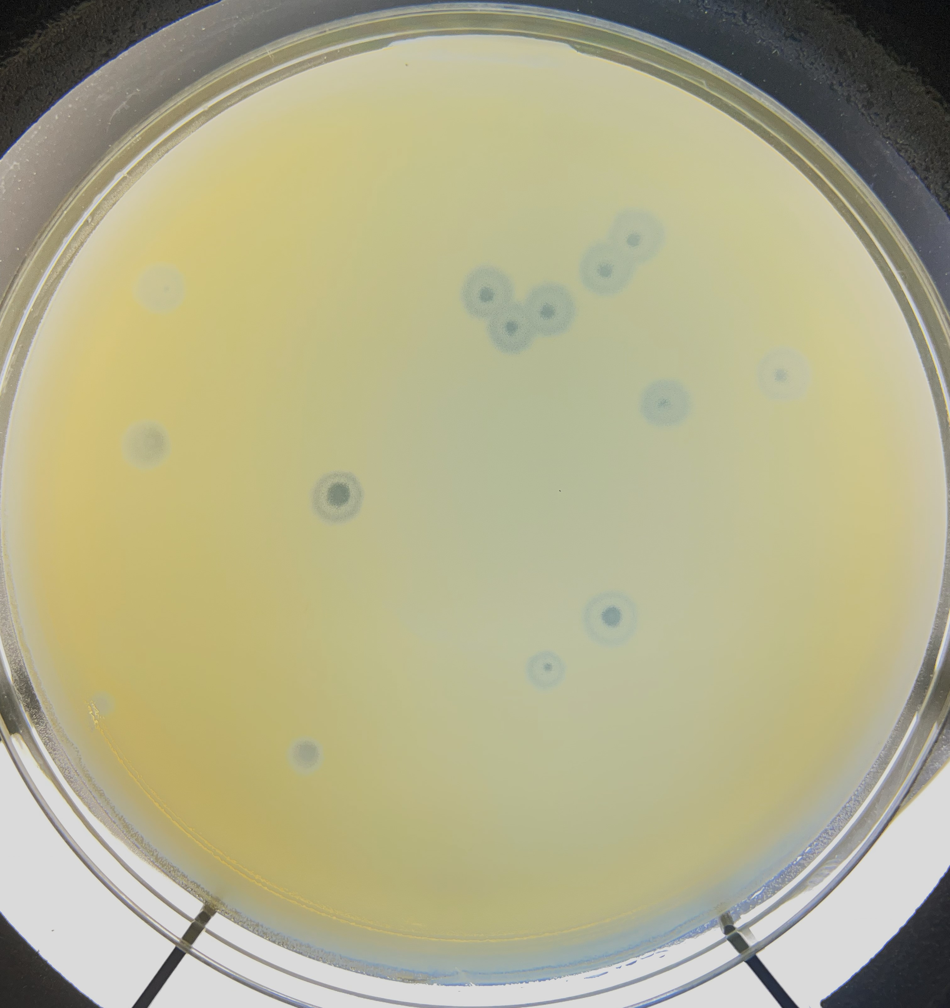 | Plaque Notes | On standard plates (0.4% top agar, 100 uL host), plaques are tiny, very turbid, and almost invisible. On modified top agar plates (top agar diluted 1:1 with phage buffer + 10% glycerol to a final 0.2% agar; 25 uL host), plaques are large (4.5-5.5 mm, n=10) and turbid with variable clear centers. |