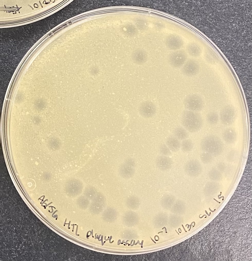 | Plaque Notes | Temperate phage presenting is slightly different sizes. HTL concentration 5.4*10^10 PFU/mL Plaques ranging from 0.3cm to 0.6cm |